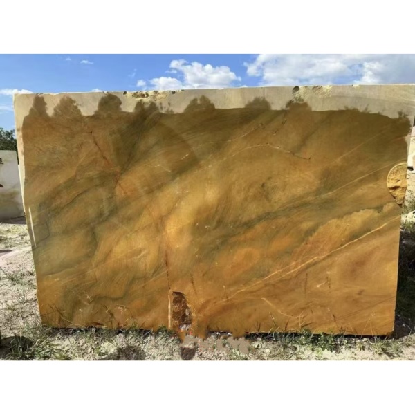 Formed from sandstone that has been metamorphosed under intense heat and pressure, quartzite is much harder and more durable than regular sandstone. Golden Sunset Quartzite, specifically, features a blend of rich yellow tones with veins of brown, black, making each slab distinctive. The variety of colors and textures give it a natural charm, making it an ideal choice for a wide range of applications, from countertops and TV background and wall cladding.